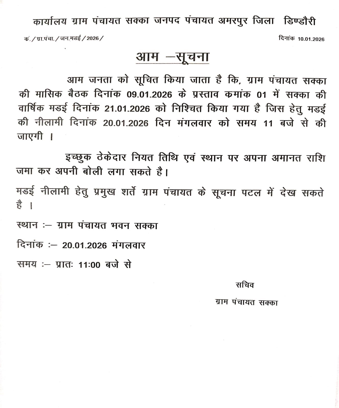 जिले के जनपद पंचायत अमरपुर क्षेत्र अंतर्गत ग्राम पंचायत सक्का में प्रत्येक वर्ष अनुसार इस वर्ष भी मड़ई मेला का आयोजन 21 जनवरी 2026 को किया गया हैं, ग्राम पंचायत सक्का की मासिक बैठक दिनांक 09/01/2026 के प्रस्ताव क्रमांक 01 के अनुसार 20 जनवरी 2026 कों मड़ई मेला की नीलामी समय 11 बजे से की जाएगी मेला / मड़ई नीलामी या बोली लगाने के लिए सभी सम्मानित बन्धु ग्रामवासियों और व्यापारियों व ठेकेदारों को सूचित किया जा रहा हैं, कि समय 11 बजे निर्धारित समय सीमा को ध्यान में रखते हुए कार्यालय ग्राम पंचायत सक्का में उपस्थित होकर अपने बोली लगाकर राशि जमा कर मेला मड़ई का ठेका ले सकते हैं